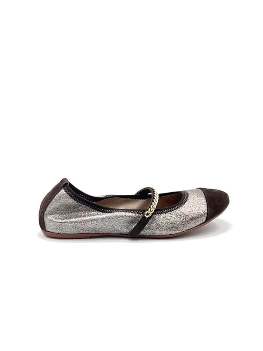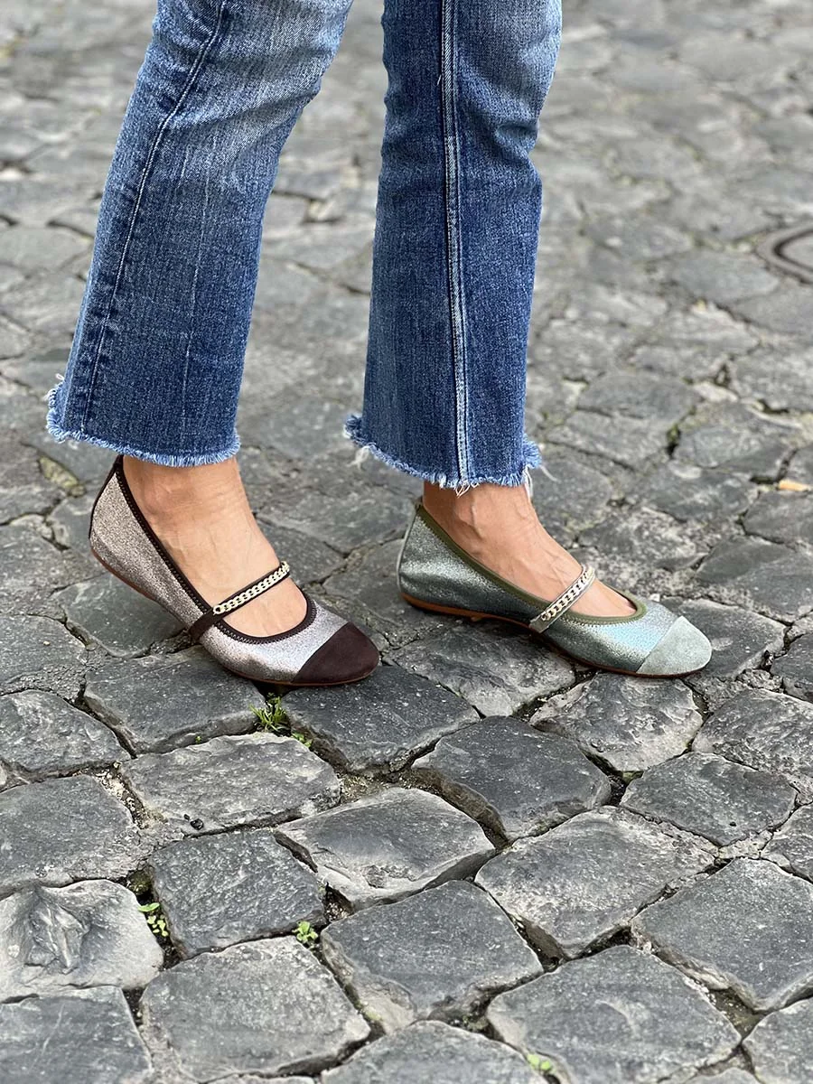 Si chiama “Ade” la nostra ballerina con rialzo interno anti tallonite di 1,5 cm. Realizzata in morbido tessuto laminato testa di moro, impreziosita da un cinturino con catena cromata oro e punta a contrasto in camoscio tono su tono. Il fondo è in gomma. Si consiglia una taglia in più.