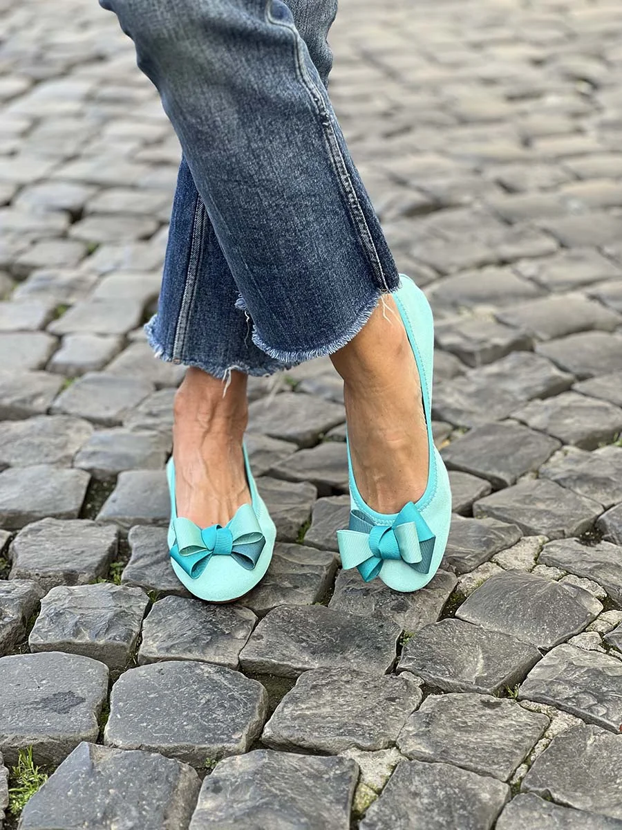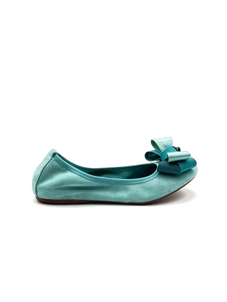 Si chiama “Alice” la nostra ballerina con rialzo interno anti tallonite di 1,5 cm. Realizzata in morbido camoscio acqua marina con fiocco in gros grain multicolor. Il fondo è in gomma. Si consiglia una taglia in più.