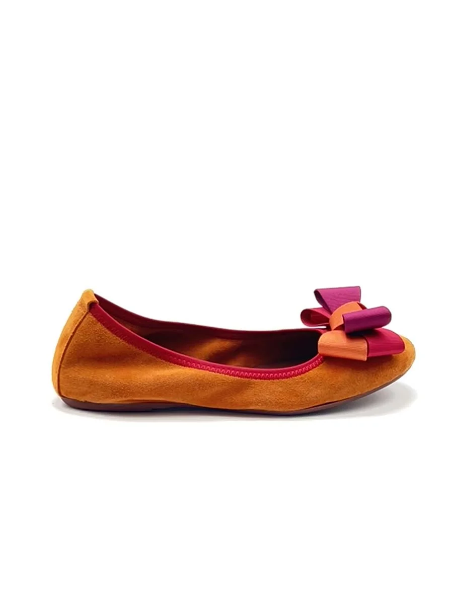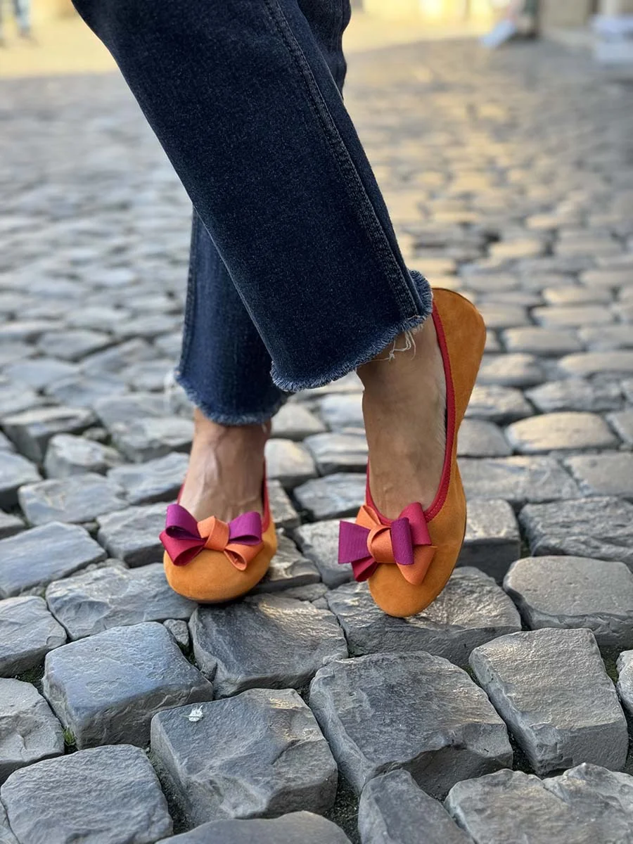 Si chiama “Alice” la nostra ballerina con rialzo interno anti tallonite di 1,5 cm. Realizzata in morbido camoscio arancio con fiocco in gros grain multicolor. Il fondo è in gomma. Si consiglia una taglia in più.