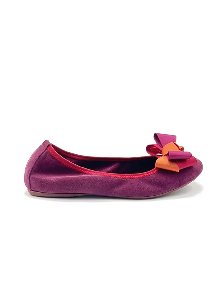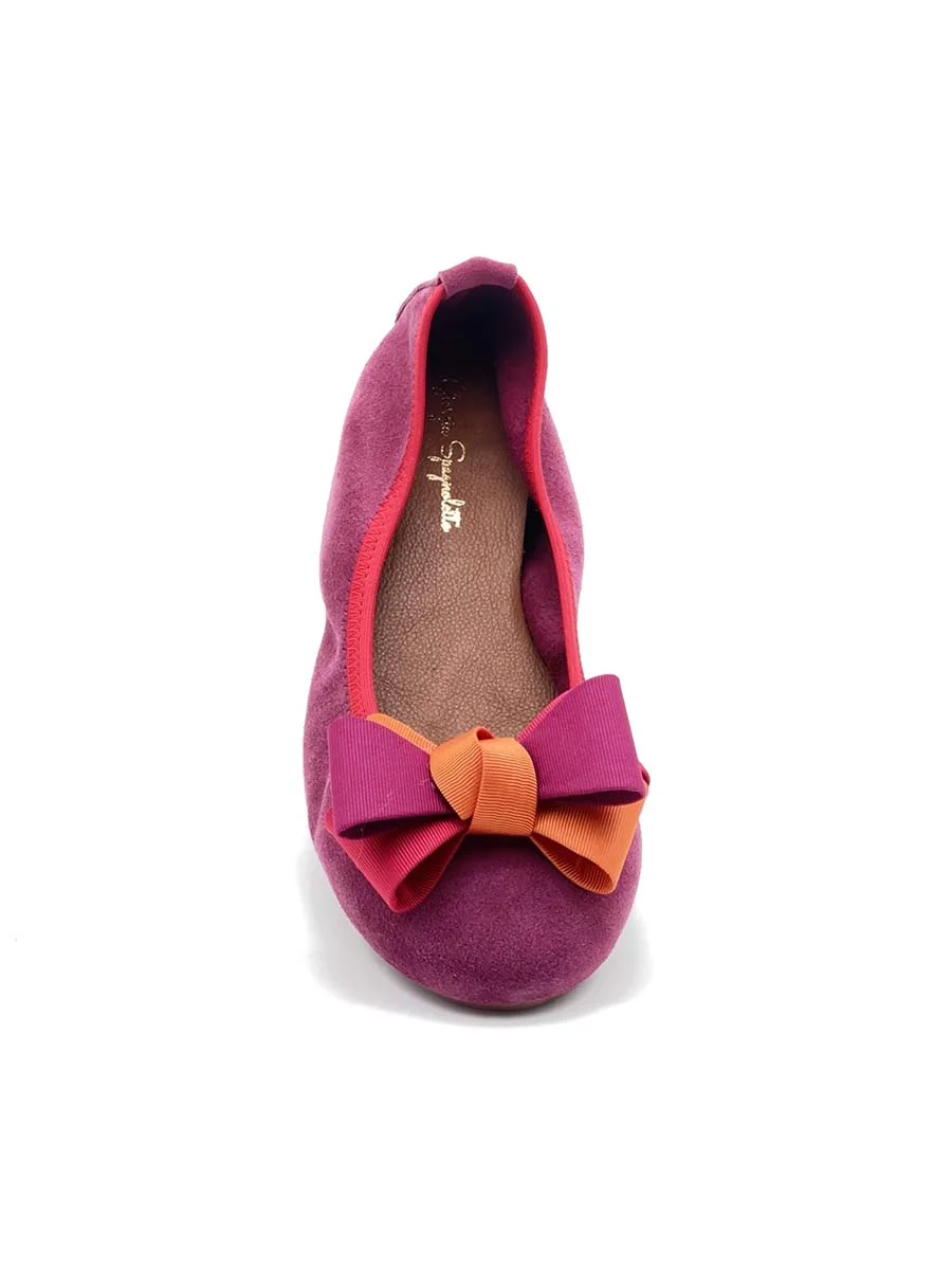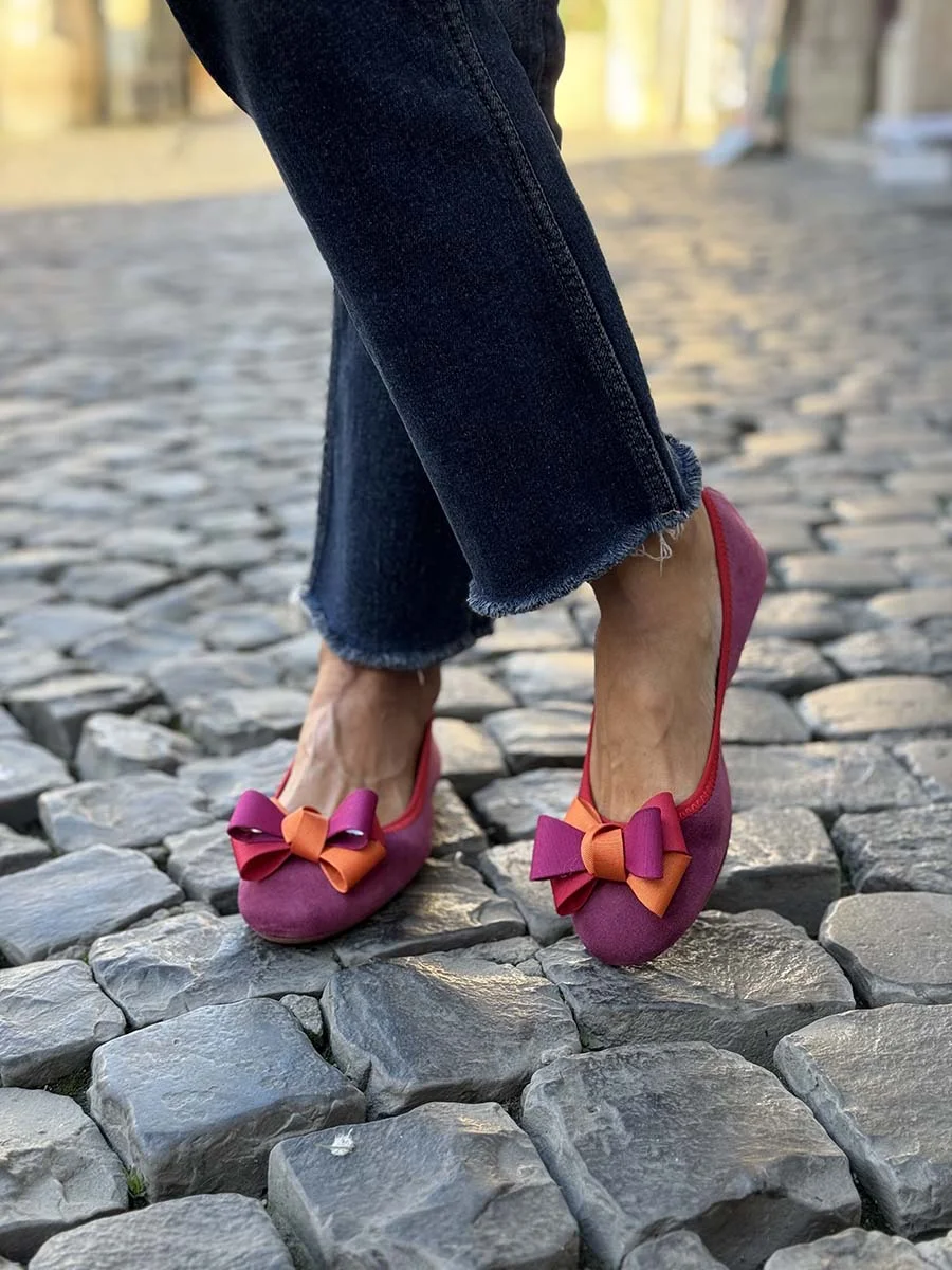 Si chiama “Alice” la nostra ballerina con rialzo interno anti tallonite di 1,5 cm. Realizzata in morbido camoscio barolo con fiocco in gros grain multicolor. Il fondo è in gomma. Si consiglia una taglia in più.
