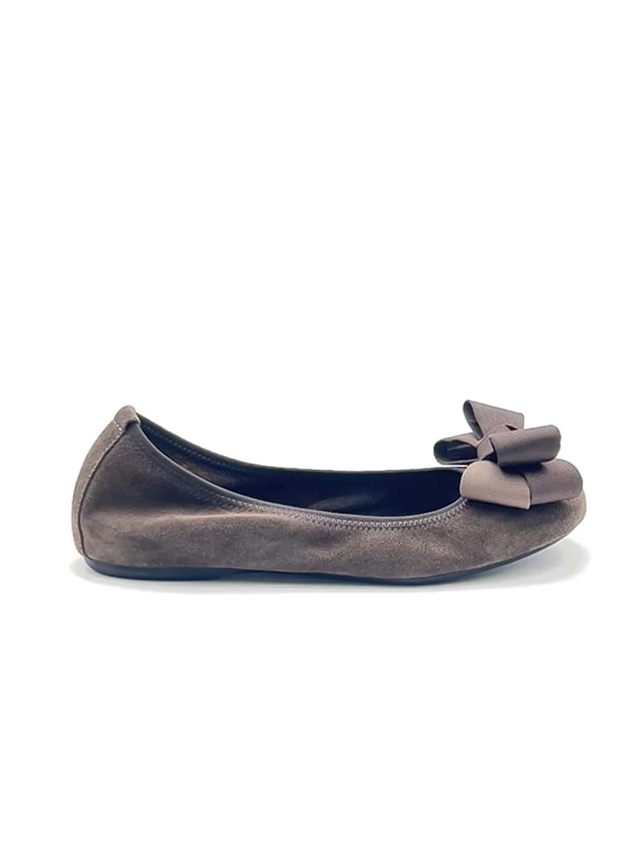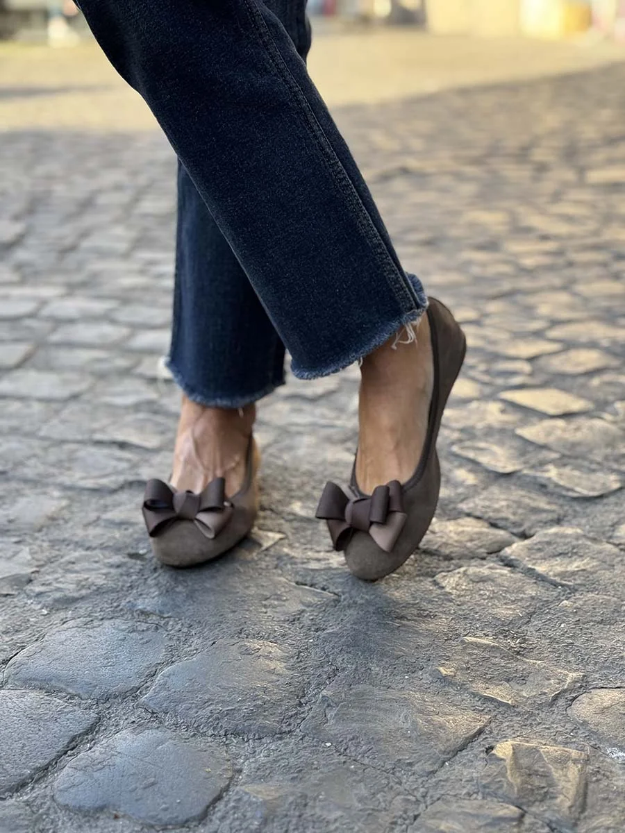 Si chiama “Alice” la nostra ballerina con rialzo interno anti tallonite di 1,5 cm. Realizzata in morbido camoscio marrone con fiocco in gros grain multicolor. Il fondo è in gomma. Si consiglia una taglia in più.