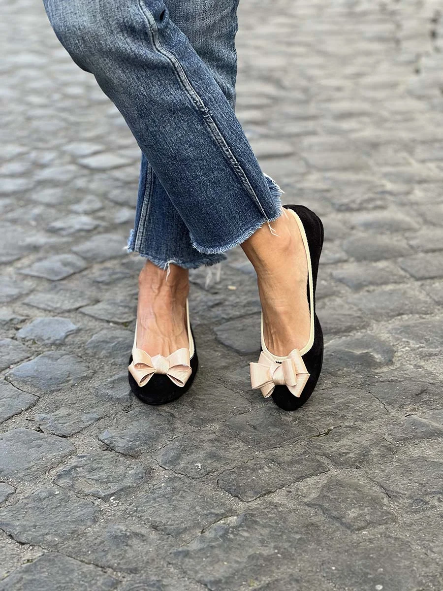 Si chiama “Alice” la nostra ballerina con rialzo interno anti tallonite di 1,5 cm. Realizzata in morbido camoscio nero con fiocco in gros grain a contrasto beige. Il fondo è in gomma. Si consiglia una taglia in più.