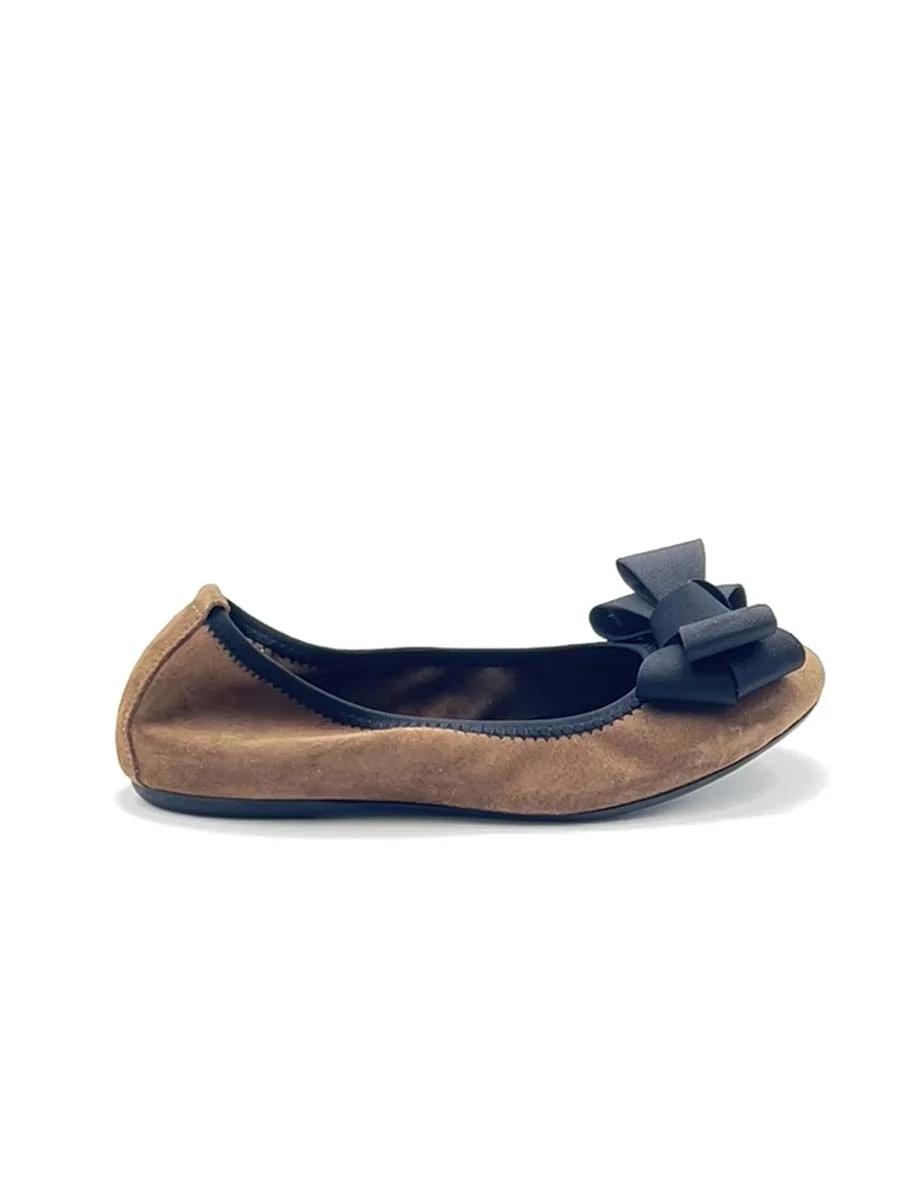 Si chiama “Alice” la nostra ballerina con rialzo interno anti tallonite di 1,5 cm. Realizzata in morbido camoscio tabacco con fiocco in gros grain a contrasto nero. Il fondo è in gomma. Si consiglia una taglia in più.