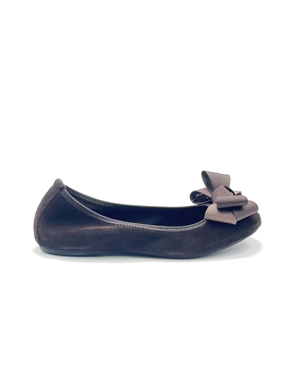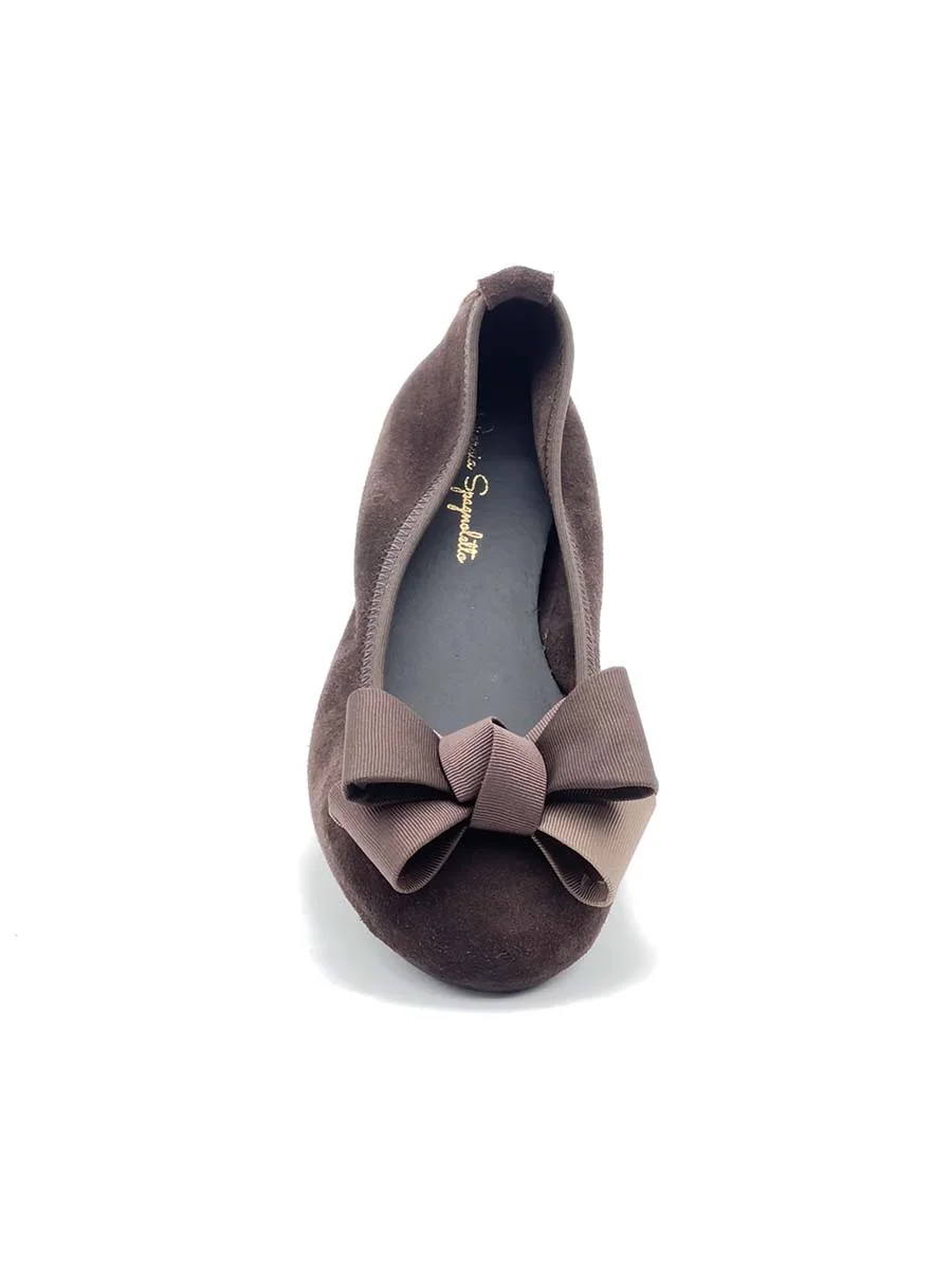 Si chiama “Alice” la nostra ballerina con rialzo interno anti tallonite di 1,5 cm. Realizzata in morbido camoscio testa di moro con fiocco in gros grain multicolor. Il fondo è in gomma. Si consiglia una taglia in più.