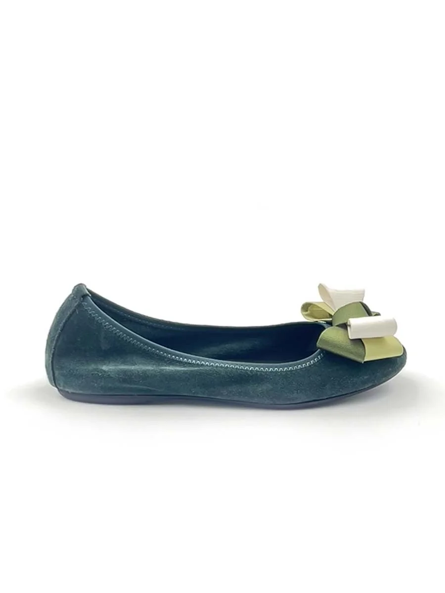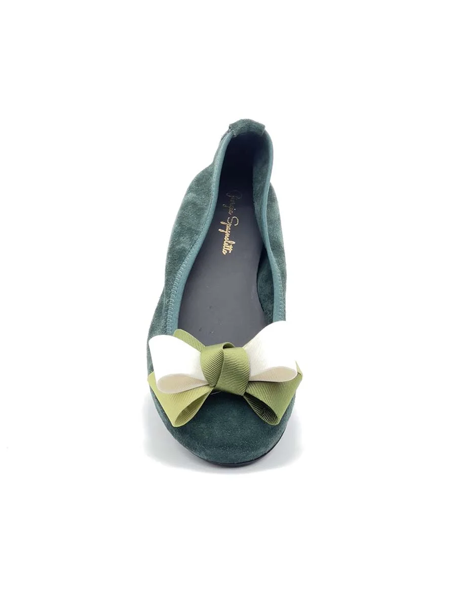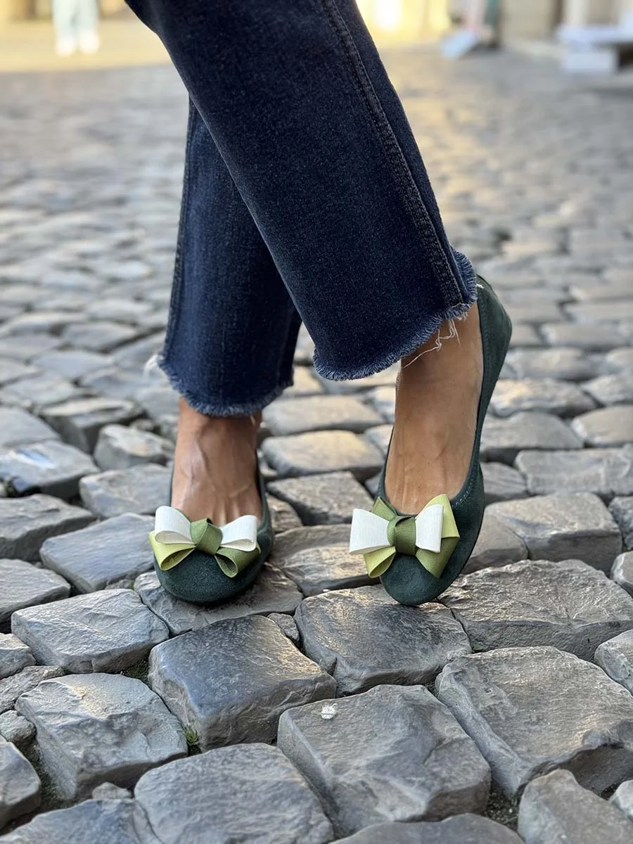 Si chiama “Alice” la nostra ballerina con rialzo interno anti tallonite di 1,5 cm. Realizzata in morbido camoscio verde bottiglia con fiocco in gros grain multicolor. Il fondo è in gomma. Si consiglia una taglia in più.