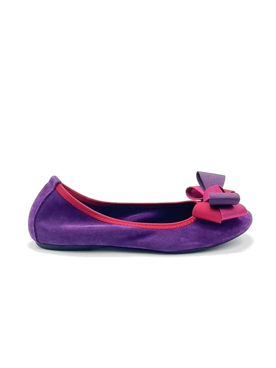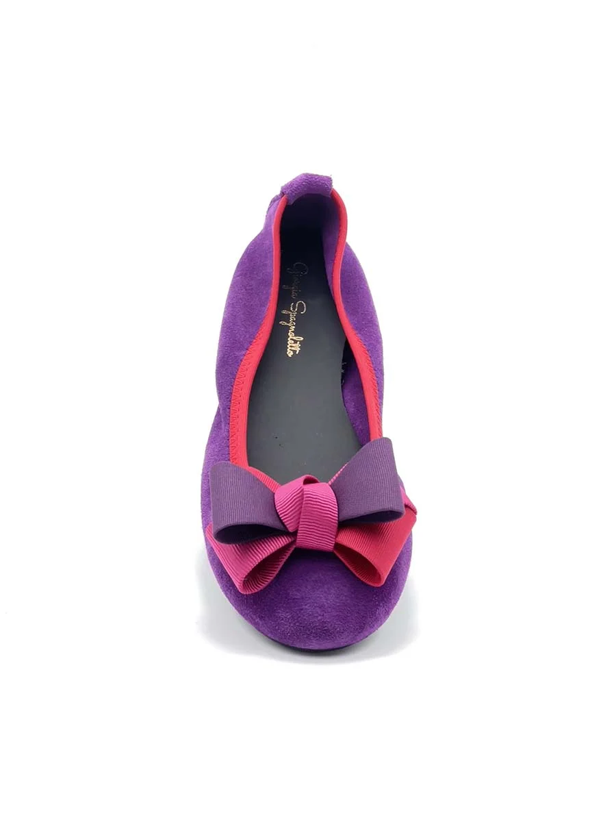 Si chiama “Alice” la nostra ballerina con rialzo interno anti tallonite di 1,5 cm. Realizzata in morbido camoscio viola con fiocco in gros grain multicolor. Il fondo è in gomma. Si consiglia una taglia in più.