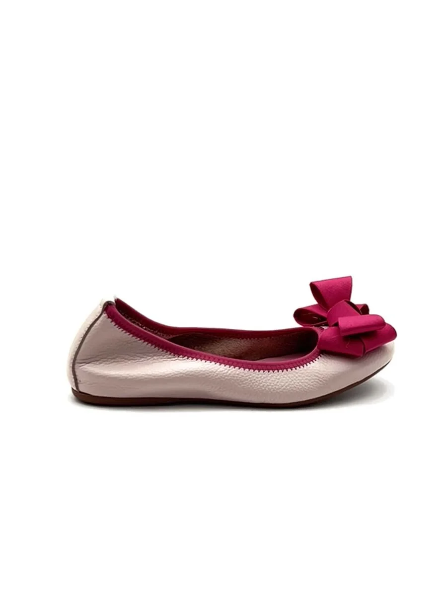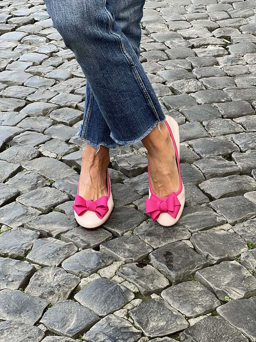 Si chiama “Alice” la nostra ballerina con rialzo interno anti tallonite di 1,5 cm. Realizzata in morbida nappa martellata rosa con fiocco in gros grain a contrasto fucsia. Il fondo è in gomma. Si consiglia una taglia in più.