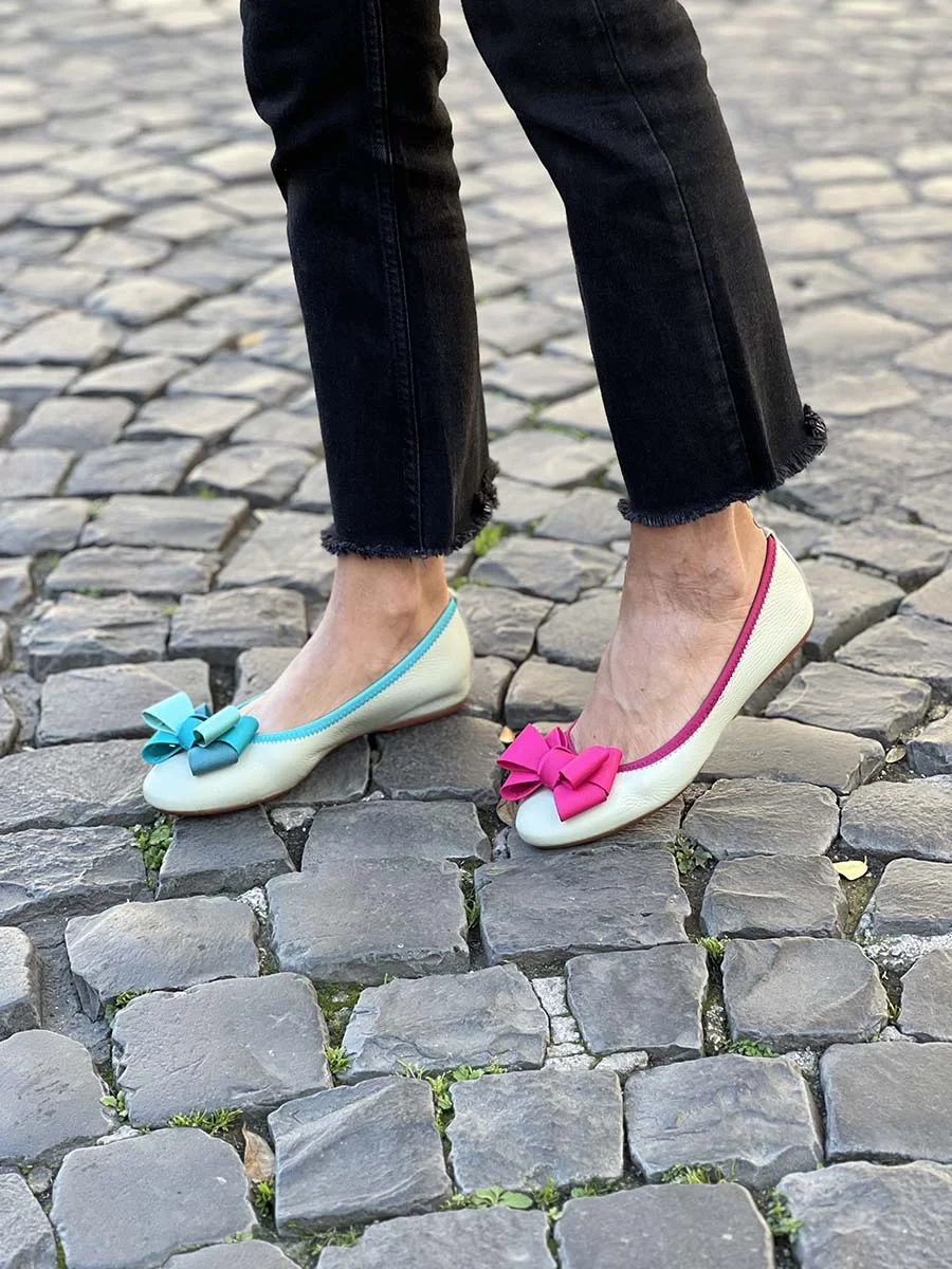Si chiama “Alice” la nostra ballerina con rialzo interno anti tallonite di 1,5 cm. Realizzata in morbida nappa martellata tè verde con fiocco in gros grain a contrasto fucsia. Il fondo è in gomma. Si consiglia una taglia in più.