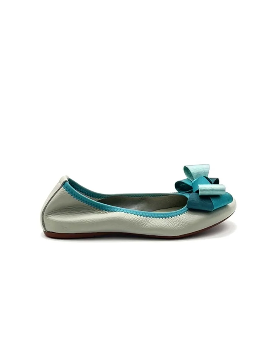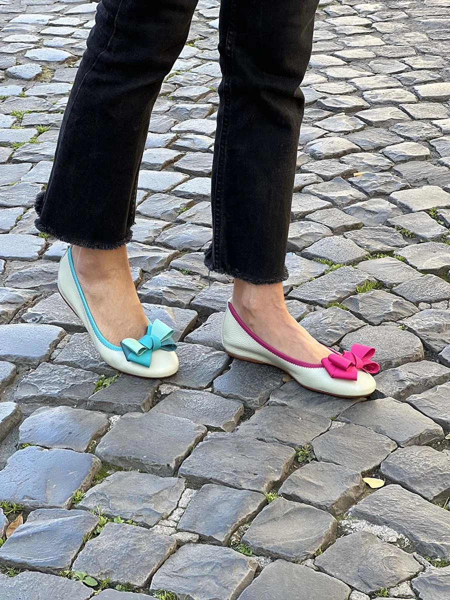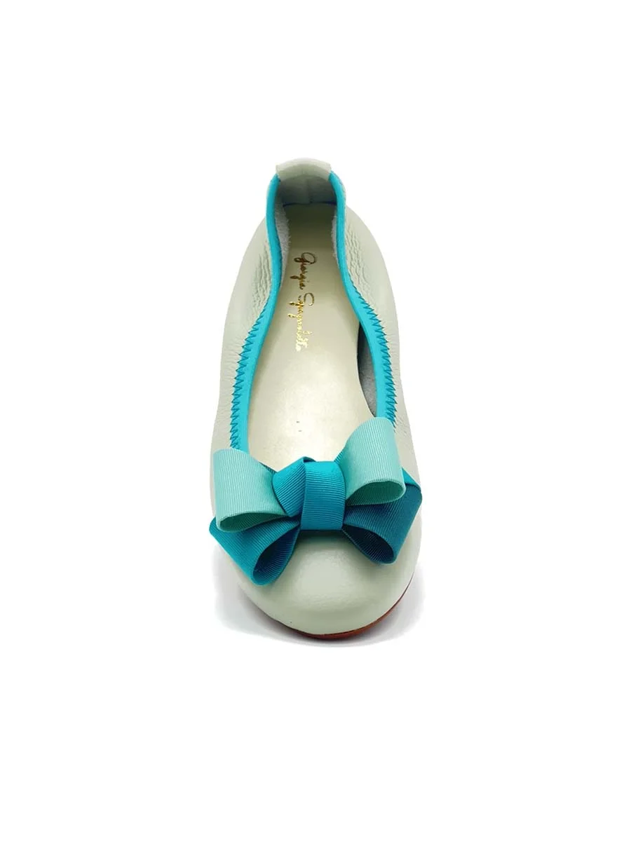 Si chiama “Alice” la nostra ballerina con rialzo interno anti tallonite di 1,5 cm. Realizzata in morbida nappa martellata tè verde con fiocco in gros grain multicolor. Il fondo è in gomma. Si consiglia una taglia in più.