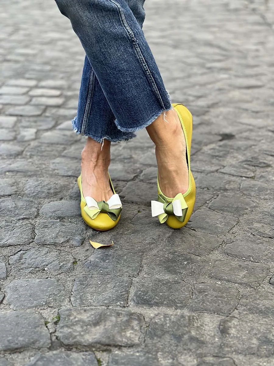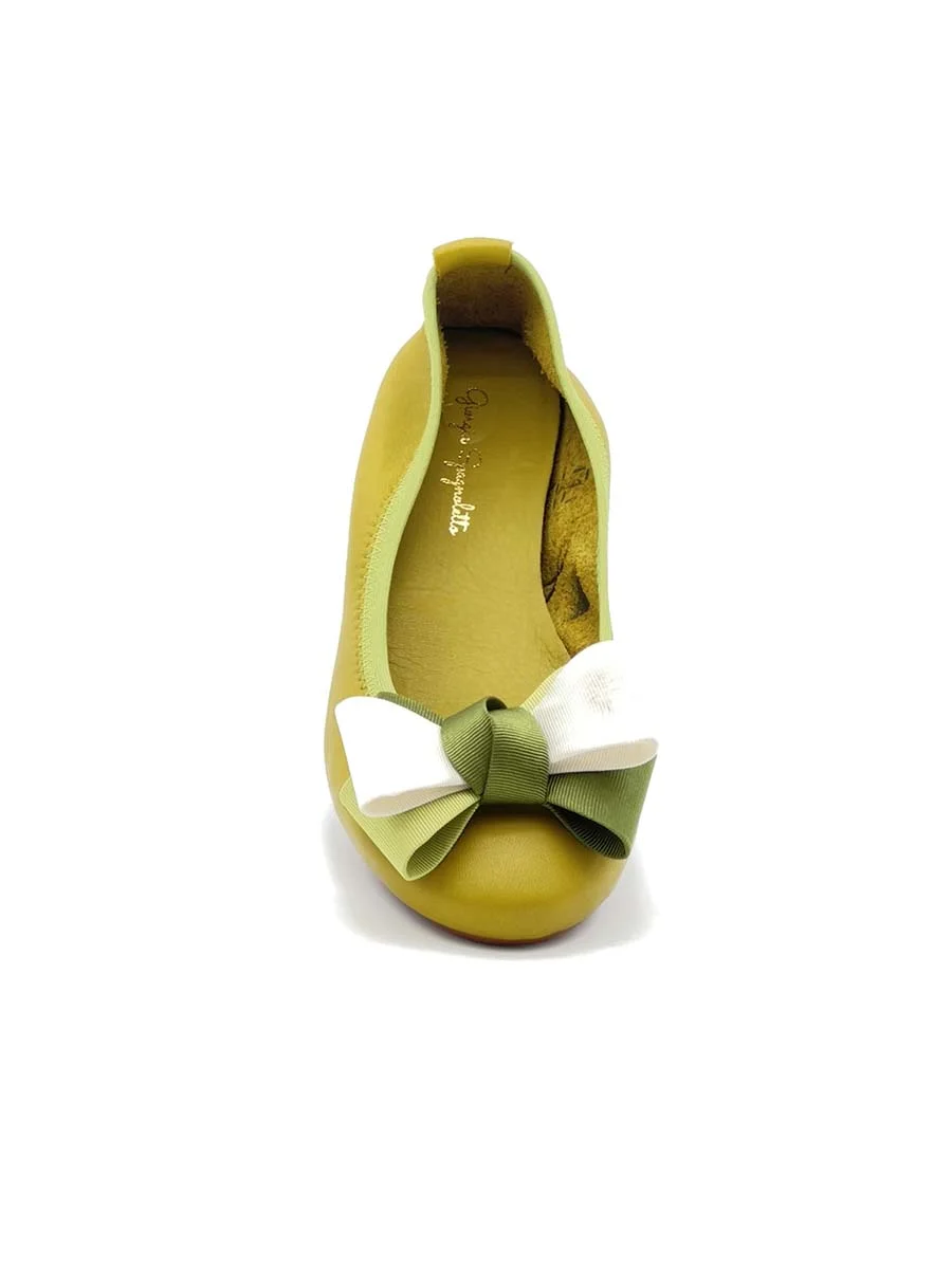 Si chiama “Alice” la nostra ballerina con rialzo interno anti tallonite di 1,5 cm. Realizzata in morbida nappa zolfo con fiocco in gros grain multicolor. Il fondo è in gomma. Si consiglia una taglia in più.