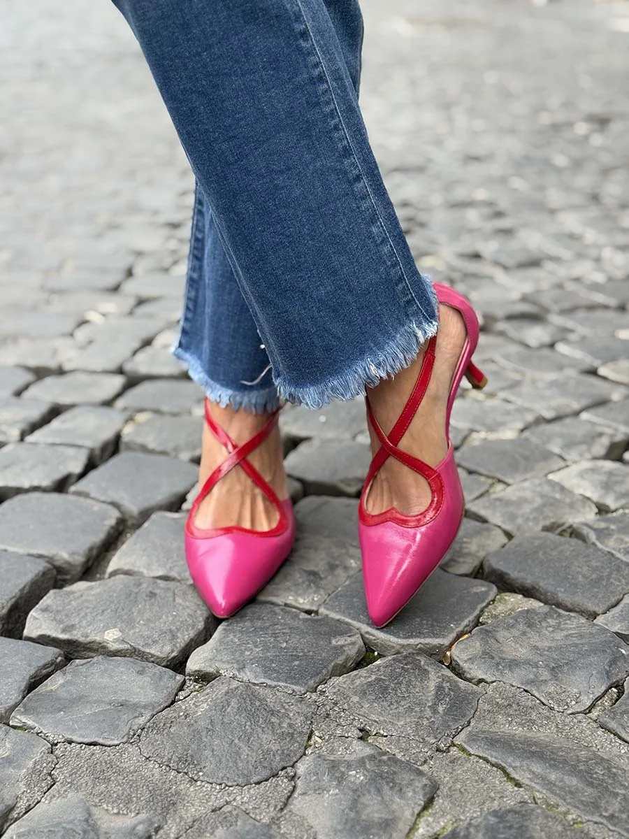 Si chiama “Barbara” il nuovo Decollete di questa stagione dalla forma a punta realizzato in morbida vernice fucsia, con sottile cinturino a incrocio regolabile alla caviglia e tacco a contrasto rosso, e con lavorazione a sacchetto che consente alla scarpa oltre che la leggerezza la massima flessibilità e comodità. Tacco a rocchetto cm 5, il fondo è in cuoio.