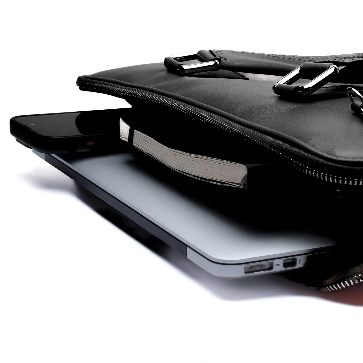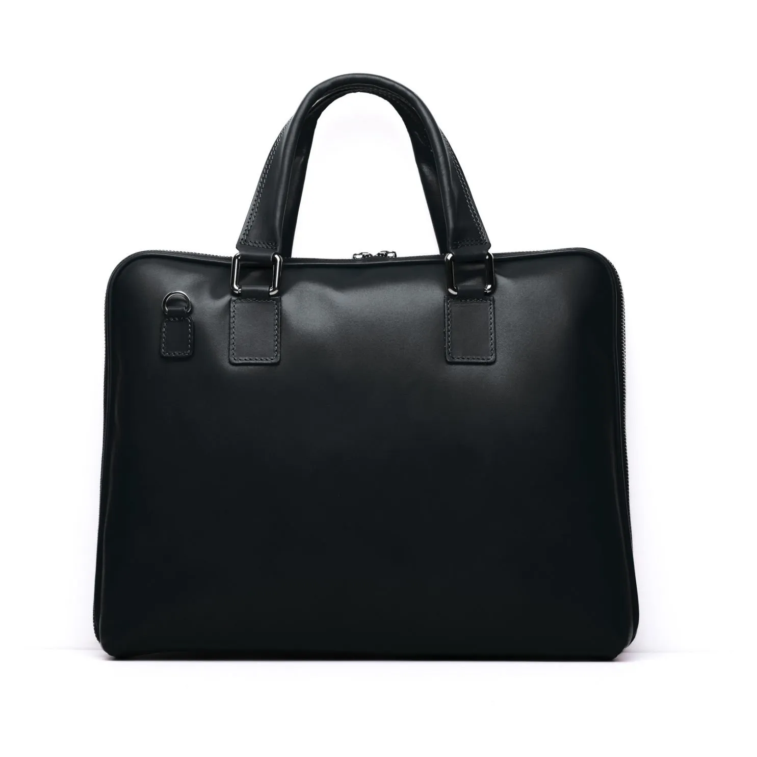 Il design è essenziale e contemporaneo: profilo sottile, doppio manico strutturato e tracolla removibile in tessuto tecnico con finiture in pelle. L’interno è pensato per contenere laptop fino a 15”, documenti e accessori personali, grazie a uno scomparto principale e tasche dedicate. Le zip in metallo cromato completano il look con un dettaglio moderno.