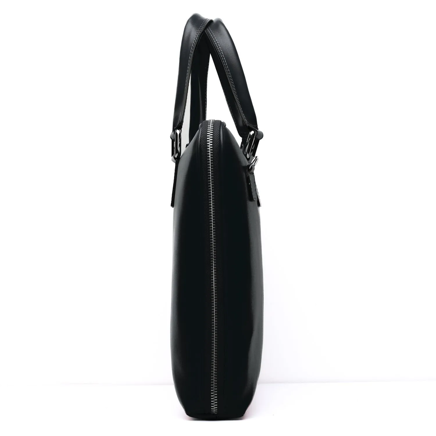 Borsa da lavoro Made in Italy realizzata in vera pelle crust tinta a mano nel colore nero, perfetta per chi cerca una sintesi tra artigianalità e funzionalità. La superficie liscia e naturale, leggermente sfumata, esalta il pregio della pelle conciata al vegetale, conferendo al pezzo un’eleganza discreta ma ricca di carattere.