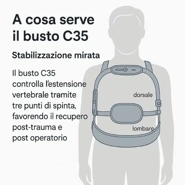 Il busto c35 iperestensore a tre punti di Kefrell è un dispositivo ortopedico avanzato, pensato per garantire un supporto mirato e stabile alla colonna vertebrale nei casi di fratture o patologie a carico del tratto dorsale e dorso-lombare.