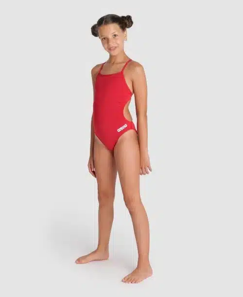 Arena crea costumi per le federazioni e i club di nuoto utilizzando materiali innovativi e design testati dagli atleti come il costume intero da bambina Team Challenge back tinta unita Arena.