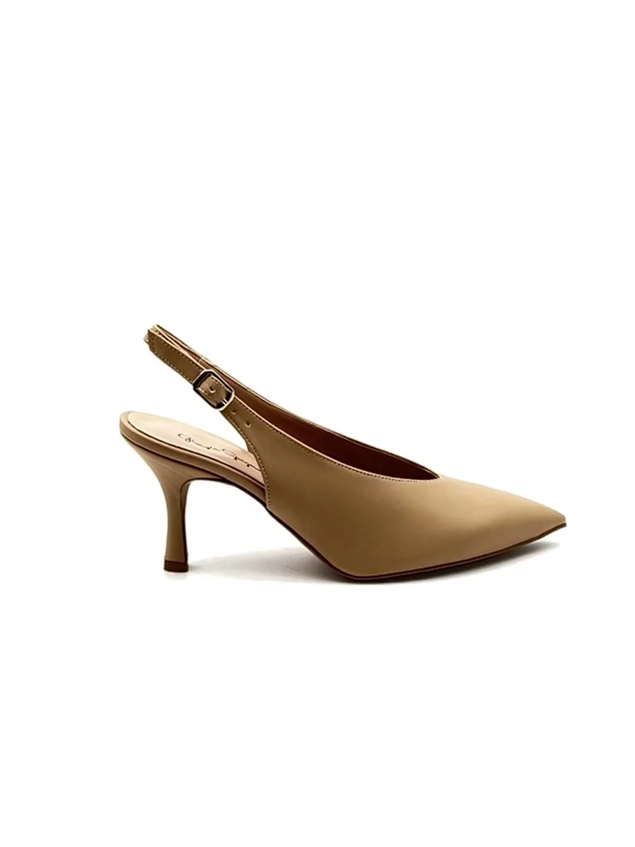 Si chiama “Diletta” il nuovo Slingback di questa stagione dalla forma a punta realizzato in morbida nappa beige. Tacco a rocchetto cm 7, il fondo è in cuoio.