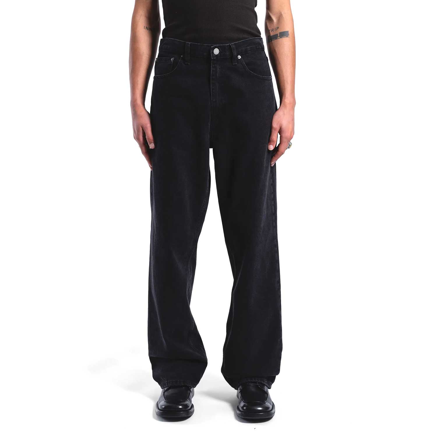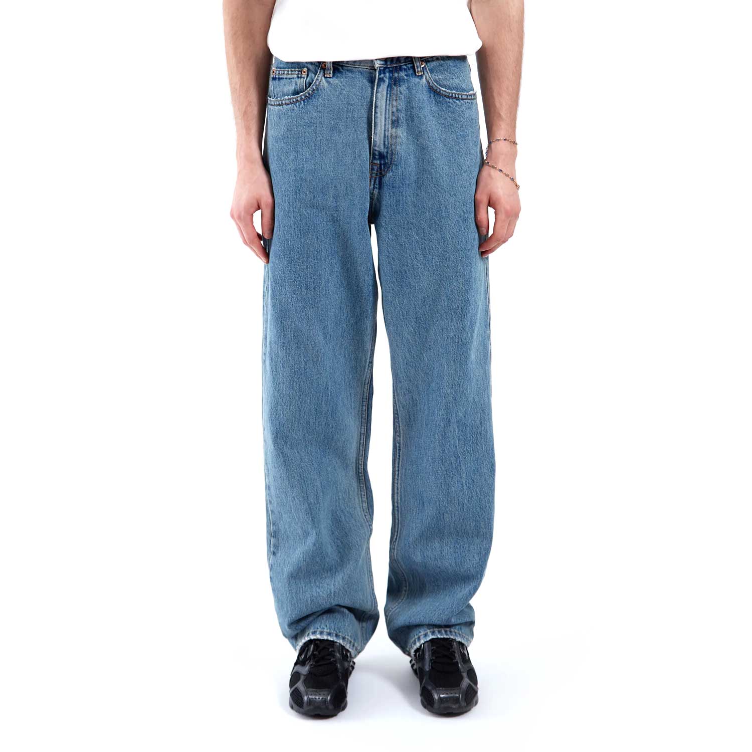 Realizzati in denim rigido 100% cotone, questi jeans uniscono estetica autentica e comfort naturale. La vestibilità relaxed con vita media e gamba ampia dritta crea un look contemporaneo e rilassato, mentre la costruzione a 5 tasche e la chiusura con zip mantengono un’impronta classica e senza tempo. Perfetti per chi cerca un capo versatile dal carattere deciso.