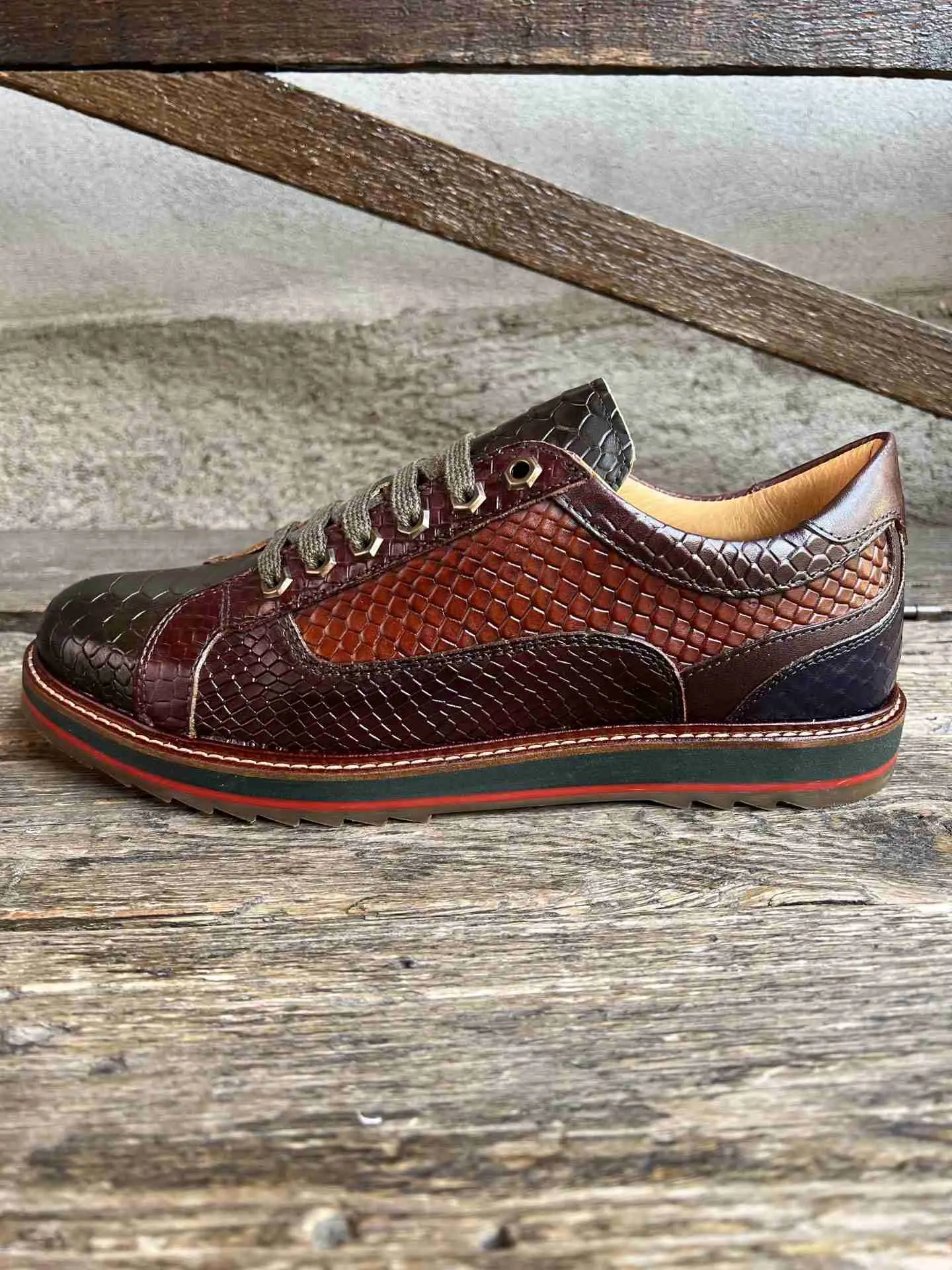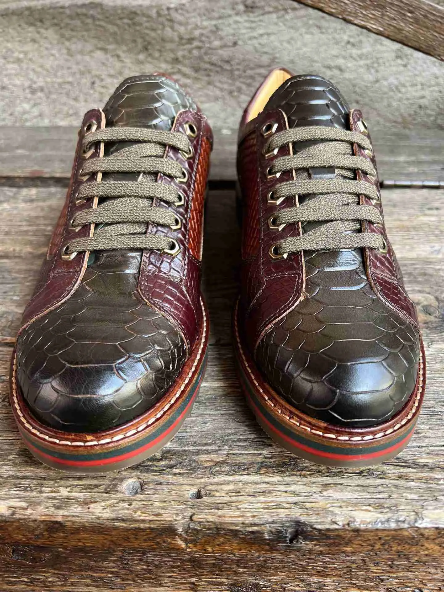 La tomaia è un abbinamento di pellami con texture differenti in stampa rettile e colori che variano dal verde al marrone e cuoio, ultimando in una suola triplo colore che completa armoniosamente il tutto.