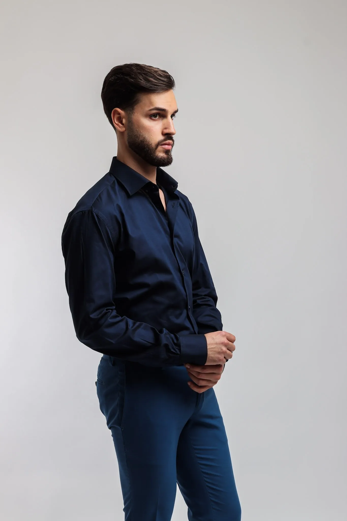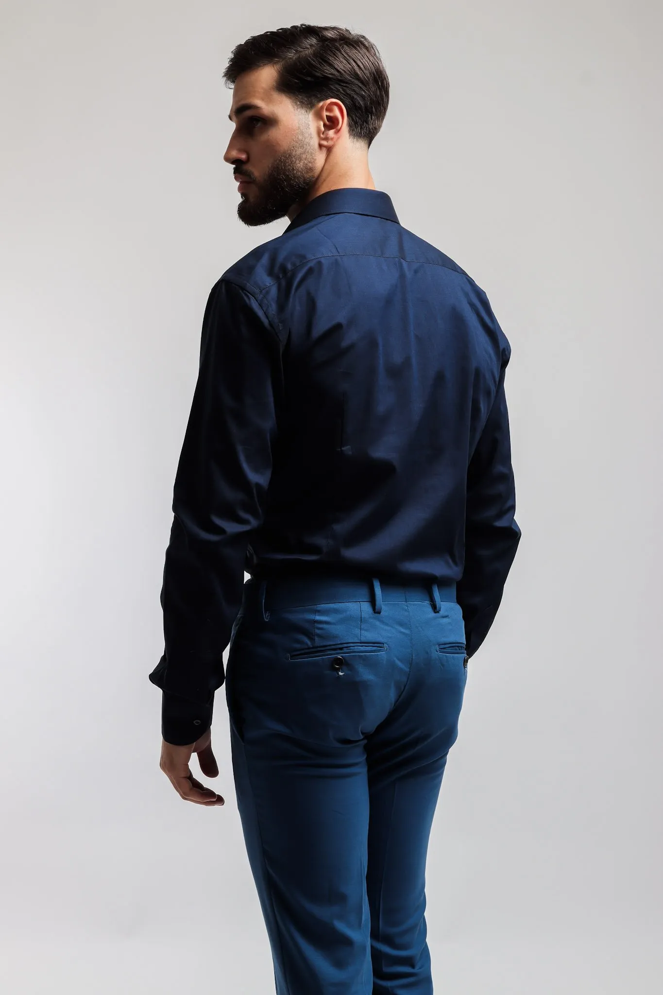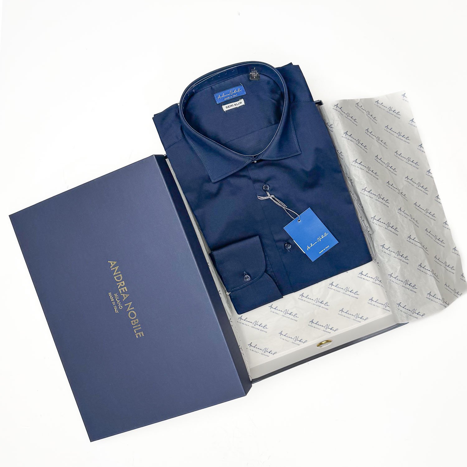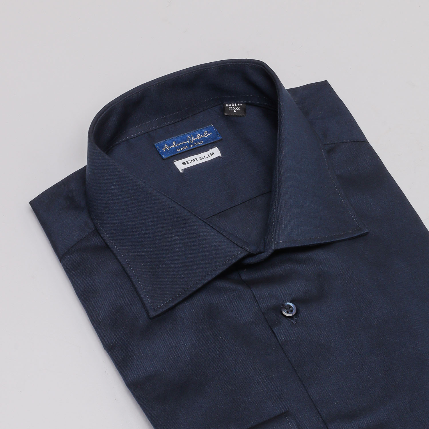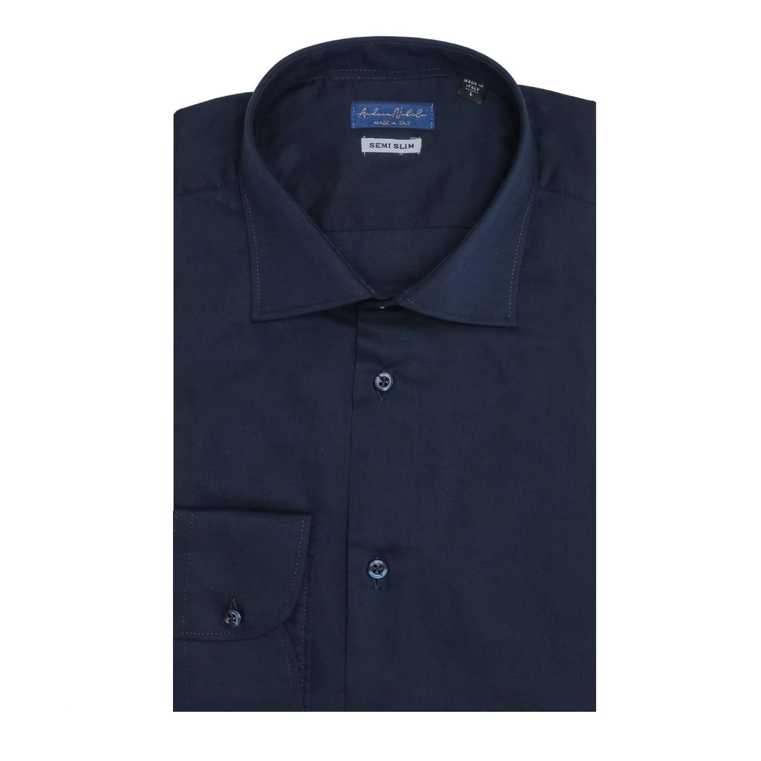Camicia made in Italy nel colore blu, collo mezzo francese con polsini con angoli arrotondati e un bottone.