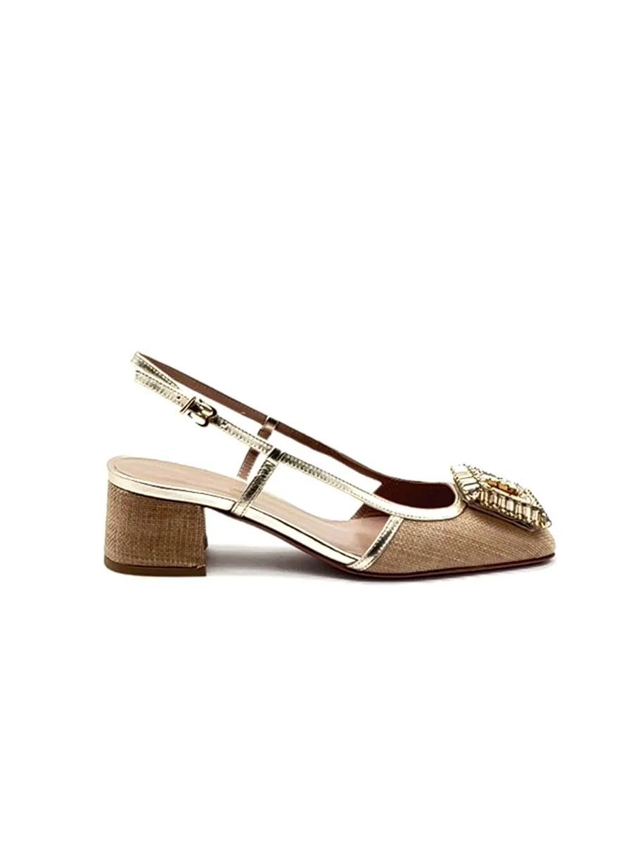 Si chiama “Lorenza” la nuova Slingback di questa stagione, dalla forma squadrata, tomaia realizzata in morbida rafia beige, con profili e cinturino regolabile a contrasto in pelle laminata platino e accessorio in “Swarovski”. Tacco cm 5. Il fondo è in cuoio.