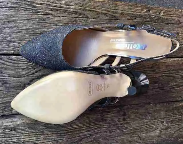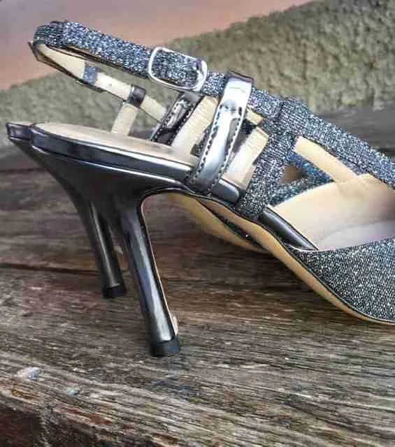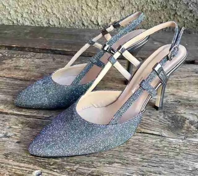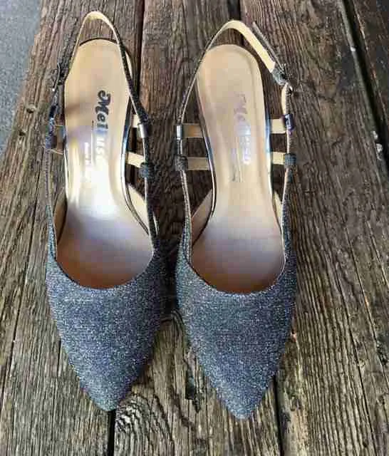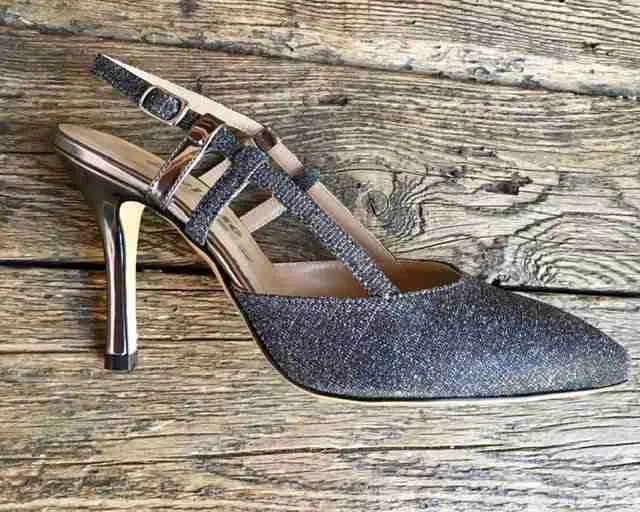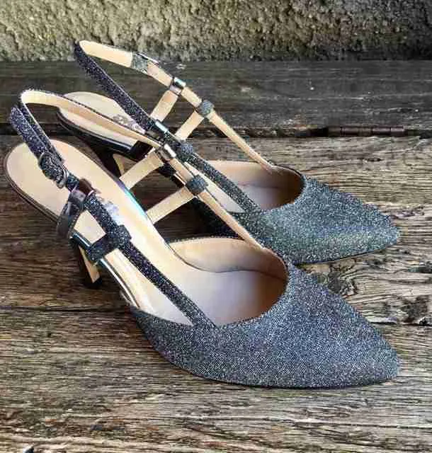 Eleganza senza freni nel sandalo chiuso in punta in tessuto glitterato galassia con toni dall’argento all’antracite.