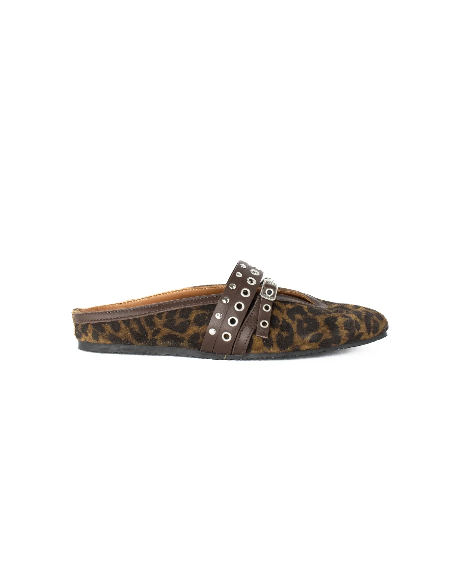Mule in morbida pelle scamosciata dal carattere deciso e contemporaneo. Le fasce in pelle con occhielli metallici donano personalità al modello, mentre la linea affusolata e la costruzione leggera garantiscono comfort e versatilità per ogni giorno.