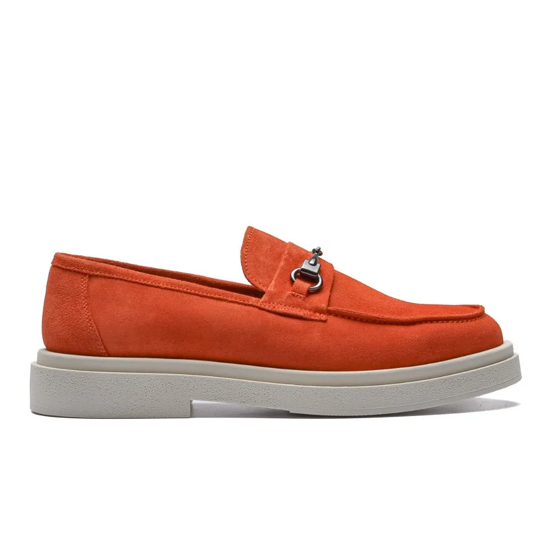 Realizzata in pelle scamosciata tinta nel colore arancione con mascherina tono su tono e applicazione di morsetto in metallo imbrunito.