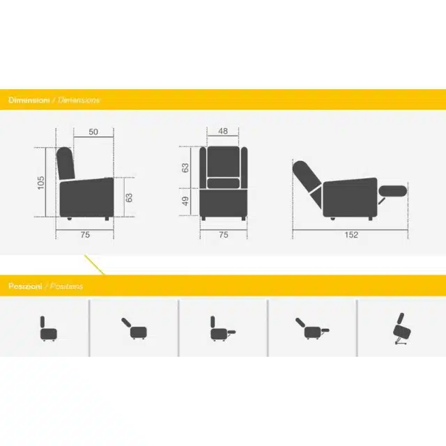 Le caratteristiche tecniche includono una larghezza totale di 77 cm, una profondità totale di 80 cm e un’altezza totale di 105 cm. Quando completamente aperta, la profondità totale della poltrona è di 152 cm. La larghezza della seduta è di 48 cm e la profondità della seduta è di 50 cm. L’altezza dello schienale è di 63 cm e l’altezza della seduta è di 49 cm.
