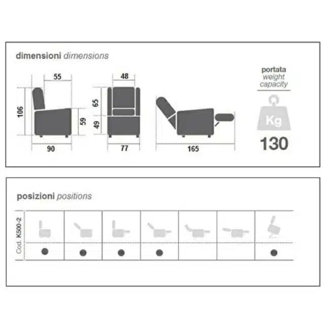 I dati tecnici includono una portata massima di 130 kg, garantendo robustezza e affidabilità per un’ampia gamma di utenti. La Poltrona Relax 2 motori K500-2 KSP è una scelta ideale per chi cerca una poltrona relax di qualità con un design moderno e funzioni avanzate per il massimo comfort durante i momenti di riposo e svago.