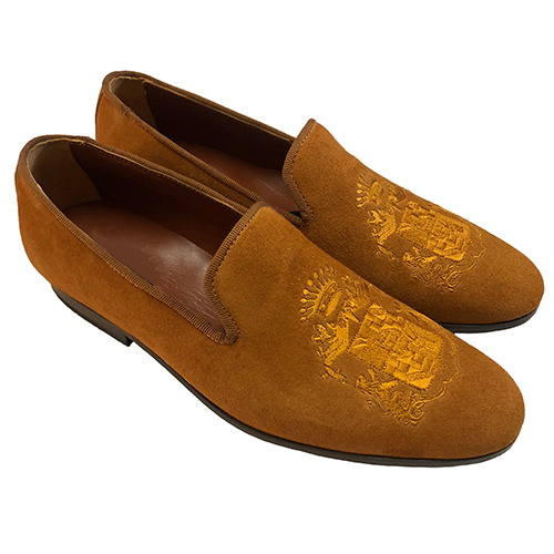 Slippers in camoscio con ricamo stemma, disponibile dal 35 al 47 calzata comoda Italiana. Calzature realizzate su ordinazione in laboratorio artigianale con pellami e materiali di prima scelta, tutto made in Italy. Dal momento dell’ordine, specificando la taglia e il colore, abbiamo di un massimo di 10 giorni lavorativi per la realizzazione. Su richiesta realizziamo anche la cintura nello stesso pellame, con l’aggiunta di 35,00 euro. Materiali: tomaia in camoscio, fodera in pelle, plantare in pelle con poron, per un miglior confort, suola in cuoio costruito e cucita blake. Scarpe disponibili in tutti i colori della cartella, si puo scegliere il colore della scarpa, la fodera in pelle o raso, il colore del ricamo e il colore del battistrada della suola. (disponibili colori della cartella)