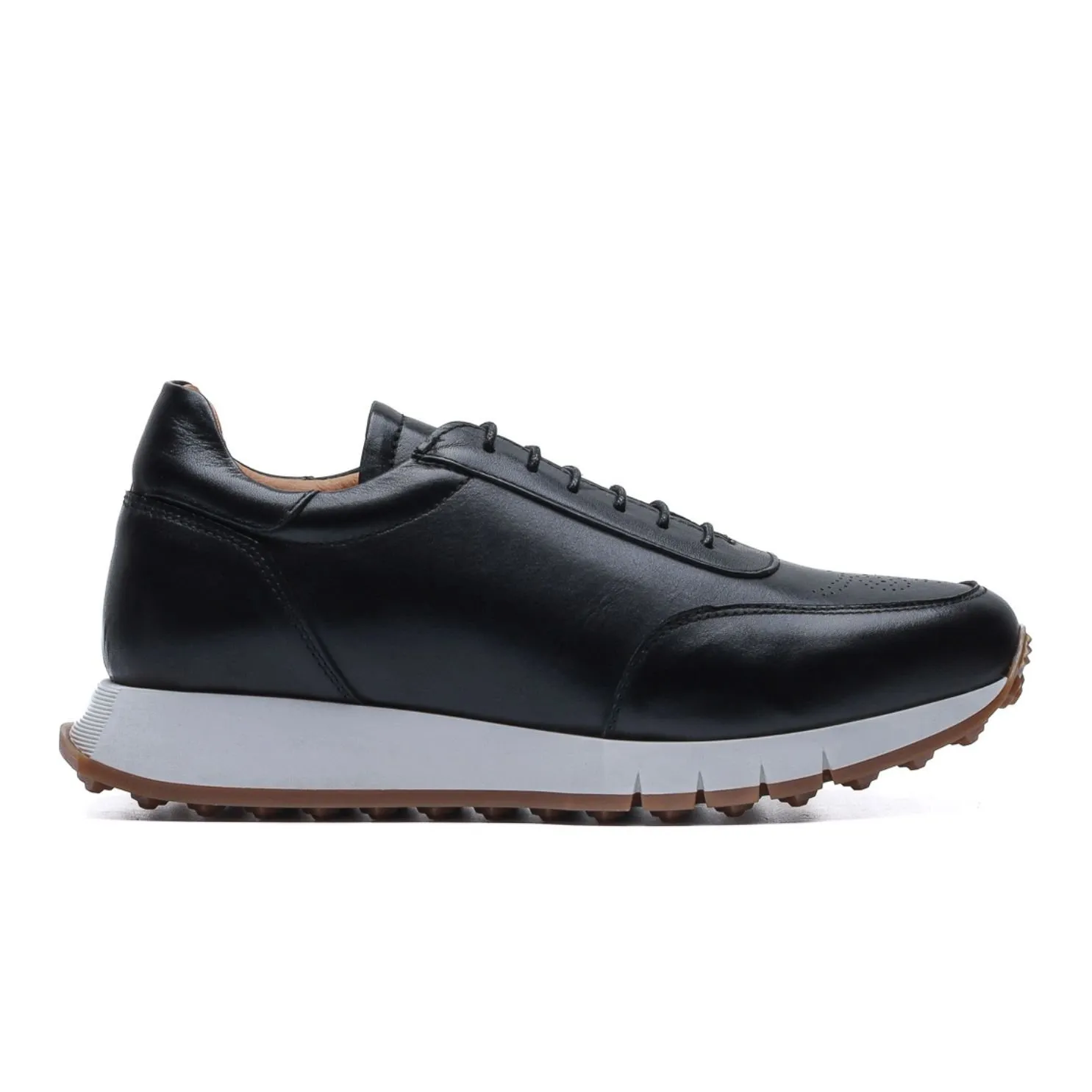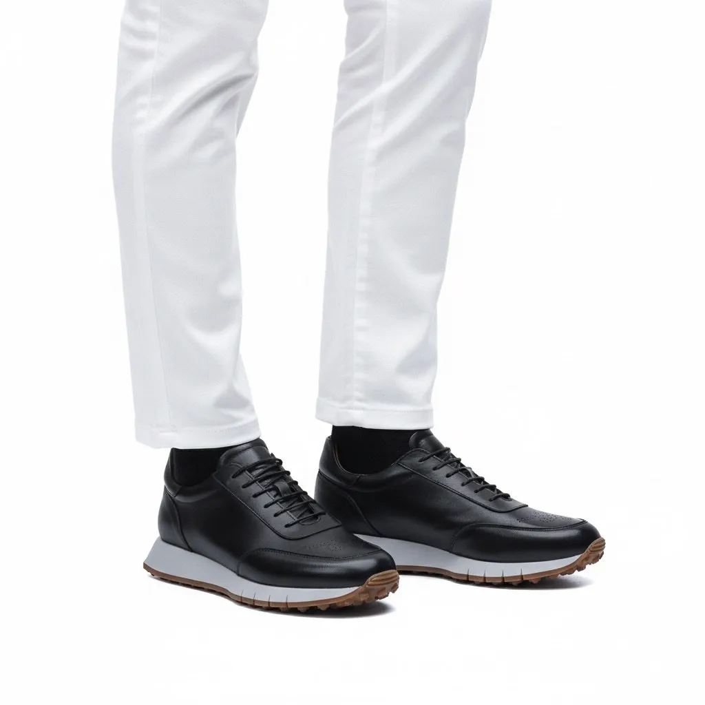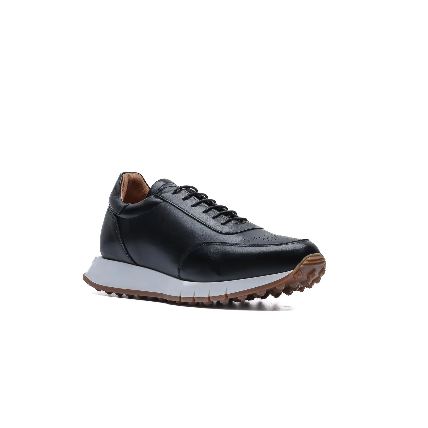 Sneaker Artigianale Made in Italy realizzata in vera pelle tinta a mano nel colore nero con sfumature naturali, dal design minimalista e raffinato.