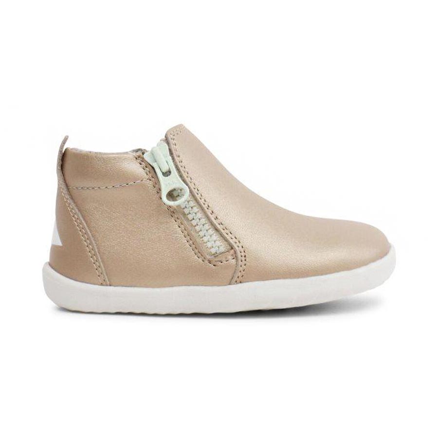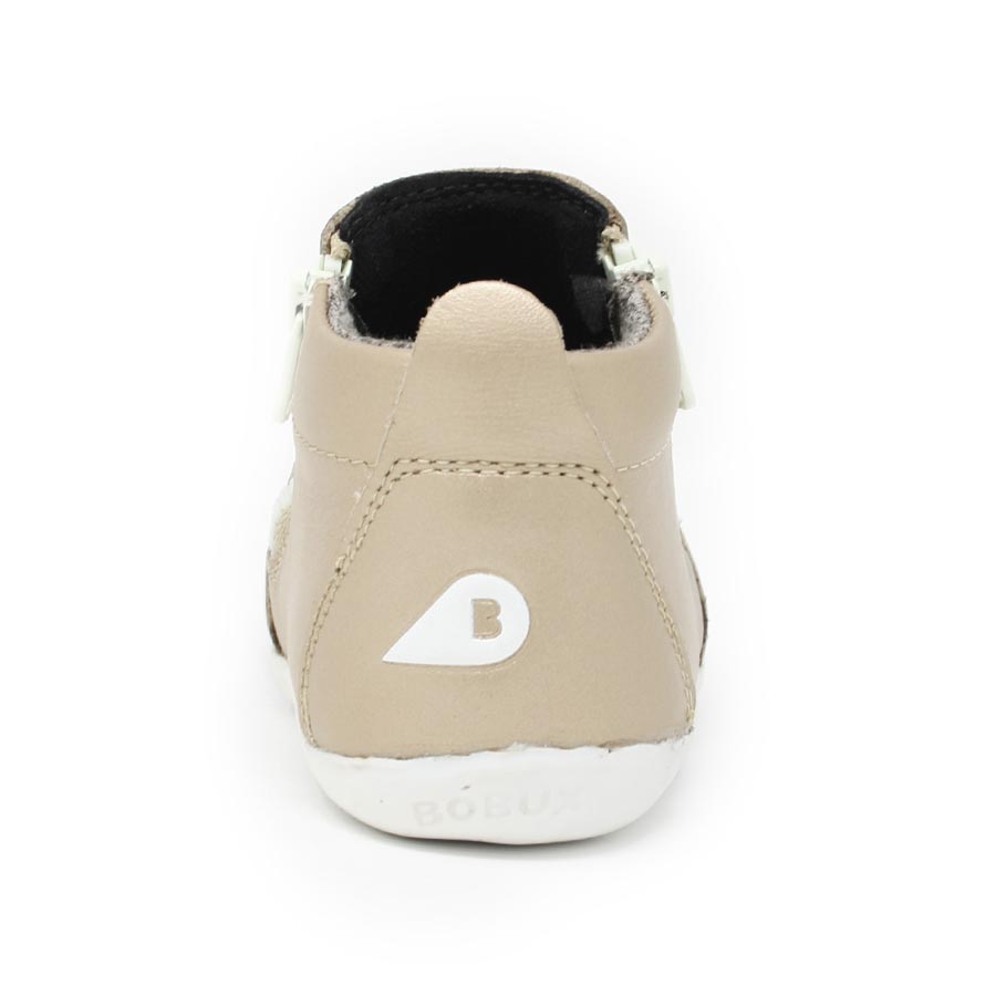 Stivaletti Bobux Step Up Tasman Boot Oro. Bobux tiene in considerazione la fase di sviluppo di un bambino, non la sua età. I modelli della linea Step Up sono stati creati specificamente seguendo la forma del piedino di un bimbo che si avvicina al momento dei primi passi, a partire dai 9 mesi fino ai 2 anni ed oltre. Quando il tuo bambino inizia a fare i suoi primi passi, in un attimo sarà in giro a esplorare e voler uscire fuori all’esterno, avendo bisogno di un paio di scarpe. Tuttavia in questa fase i loro piedini sono a forma di biscotto: grassottelli, privi di tono muscolare e con arco plantare ancora da formare. La linea Step Up risponde a tutte queste esigenze, essendo state create su calchi appositamente studiati dai podiatri per garantire uno sviluppo naturale del piede.
